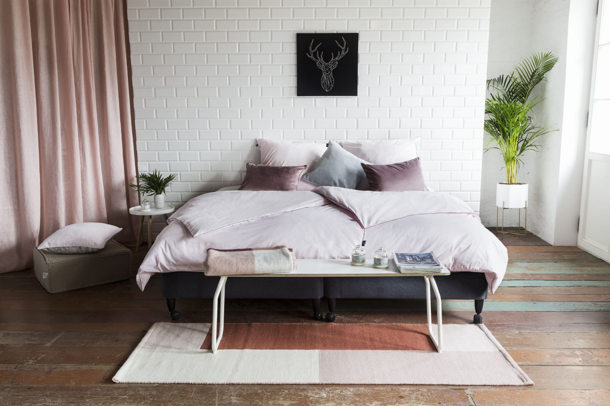 Peonia in pink bedding with minimalist gray trimming. Cotton bedding fits perfectly to accessories: a Dusty Pink pillow and Bright Stone pillow.