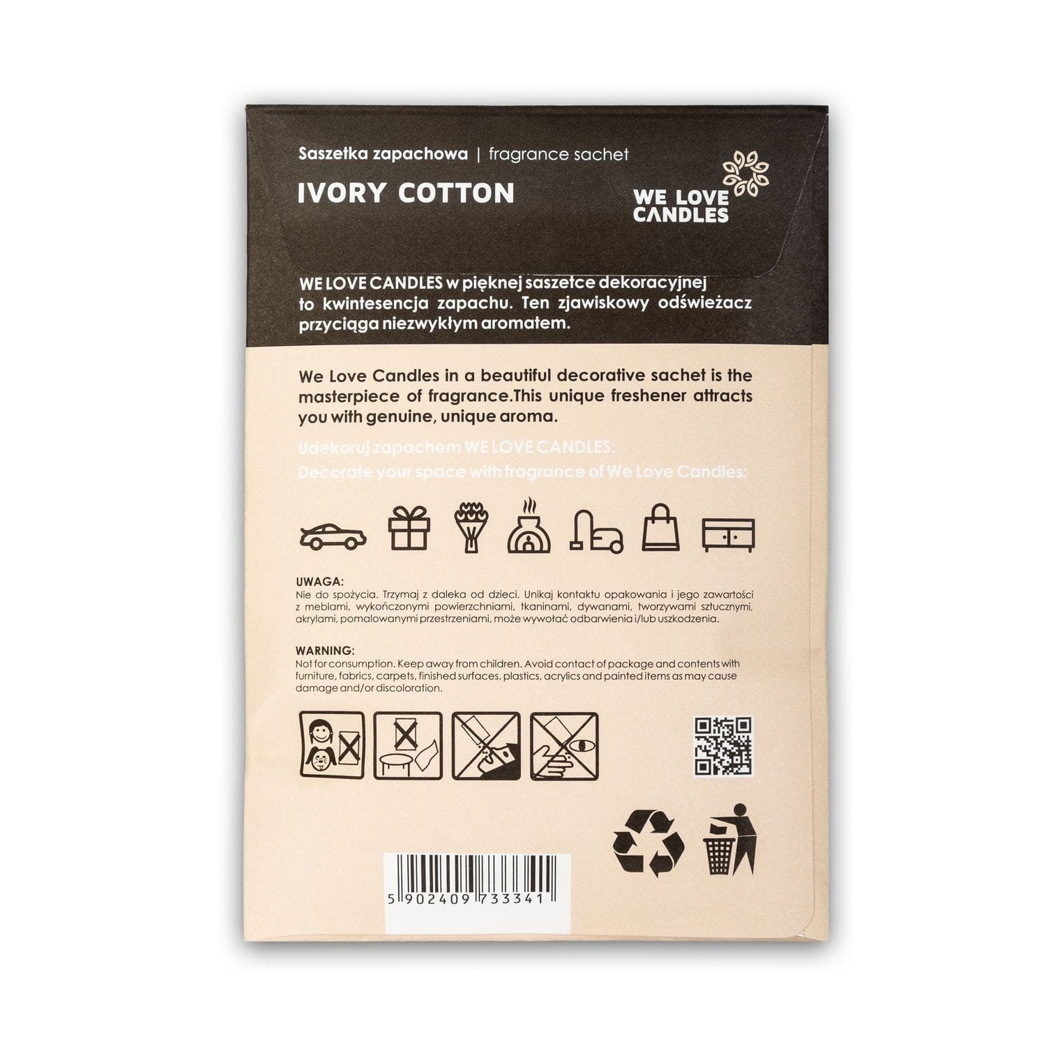 The sachets are perfect for small places such as a purse, wardrobe, wardrobe, drawer with clothes or a shoe cabinet or a car, and wherever you want to have a nice scent. The scent in the We Love Candles sachet lasts about 3 months.
